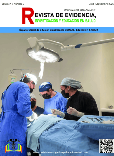 REVISTA DE EVIDENCIA, INVESTIGACIÓN Y EDUCACIÓN EN SALUD, Año 1, No. 3, Julio-Septiembre 2025, es una publicación trimestral editada por EDUSAL, Educación & Salud. Calz. de Tlalpan 1024-405, Col. Nativitas, Alc. Benito Juárez, C.P. 35000, CDMX, México. Tel. 95 1491-1235, www.revistainvestigacionyeducacionsalud.com, e-mail: reeis@edusal-salud.com. Nuestro comité editorial está integrado por diversos profesionales de las ciencias de la salud: médicos, enfermeras, odontólogos, químicos, entre otras. Editor responsable: Dr. Arturo Velásquez Paz. Reserva de Derechos al Uso Exclusivo No. 04-2024-081412483000-102, ISSN 3061-8258; ISSNe 3061-8312, ambos otorgados por el Instituto Nacional del Derecho de Autor. Certificado de Licitud de Título y Contenido No. 17783, otorgado por la Dirección General de Medios Impresos de la Secretaría de Gobernación.